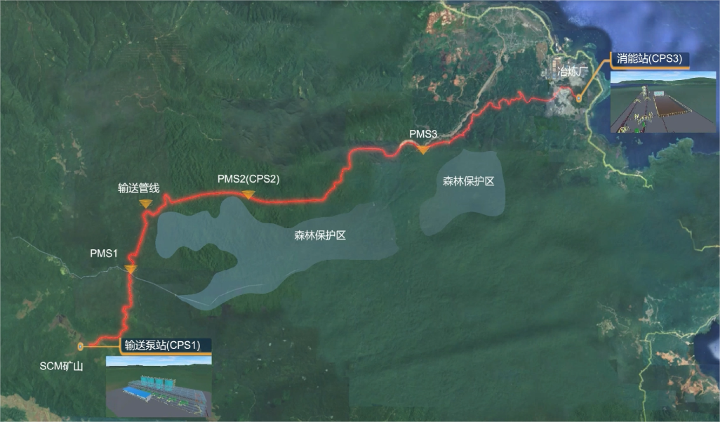 項目是連接SCM礦山和華越冶煉廠之間的“卡脖子”工程,對華越冶煉廠的原礦供給至關重要。礦漿管道沿線地形條件復雜,穿跨越數(shù)十條河流和道路,設計輸送規(guī)模達520萬噸/年,最大地形落差達650米,技術要求高,設計難度大。中國恩菲依托漿體長距離管道輸送核心專長技術,先后進行了理論計算、數(shù)值模擬、物模試驗,構建了三維可視化平臺。針對項目輸送規(guī)模大、漿體粘度大、地形高差大、管線距離長等技術特點,公司專門配套研發(fā)了兩套設計軟件,應用了先進的一站式大流量高壓并聯(lián)輸送、終端高壓消能等技術,推動了漿體長距離管道輸送技術的創(chuàng)新發(fā)展。
